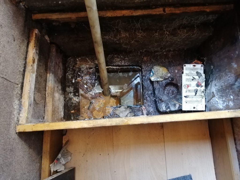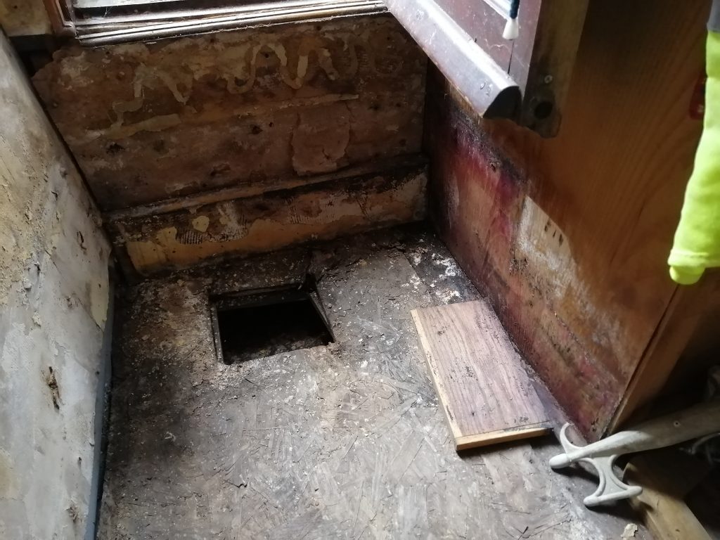 Floor almost dry and before it really fell apart wardrobe wood on the right still very wet! ( it needed replacing). The floor did end up with a massive hole later before it was replaced.