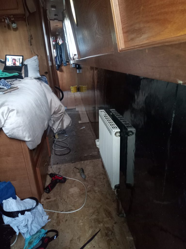 From stern door looking in through. New cover on the gunwale. New bed Hight. The radiator has been painted black. The floor cover still needs to go down. After that the skirting boards can go back.