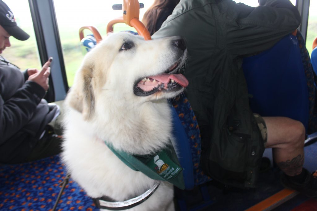 The Day ended with Connie’s first ride on a bus. A free bus had been laid in for the walkers to get back to Stroud. The Company’s kind donation of a bus and driver were greatly appreciated. The walk would not have as successful, without their generosity. Connie had not been on a bus before. I was interested in how she would react. To my surprise she marched straight on, right to the back, smartly hopping onto the middle seat in the back row and sat there!!! On hearing my intake of breath in surprise and shock, she slid off onto the floor wedging herself between the back row, when the engine started directly under where she sat! A short ride through the rolling Cotswold countryside we were back in stroud.